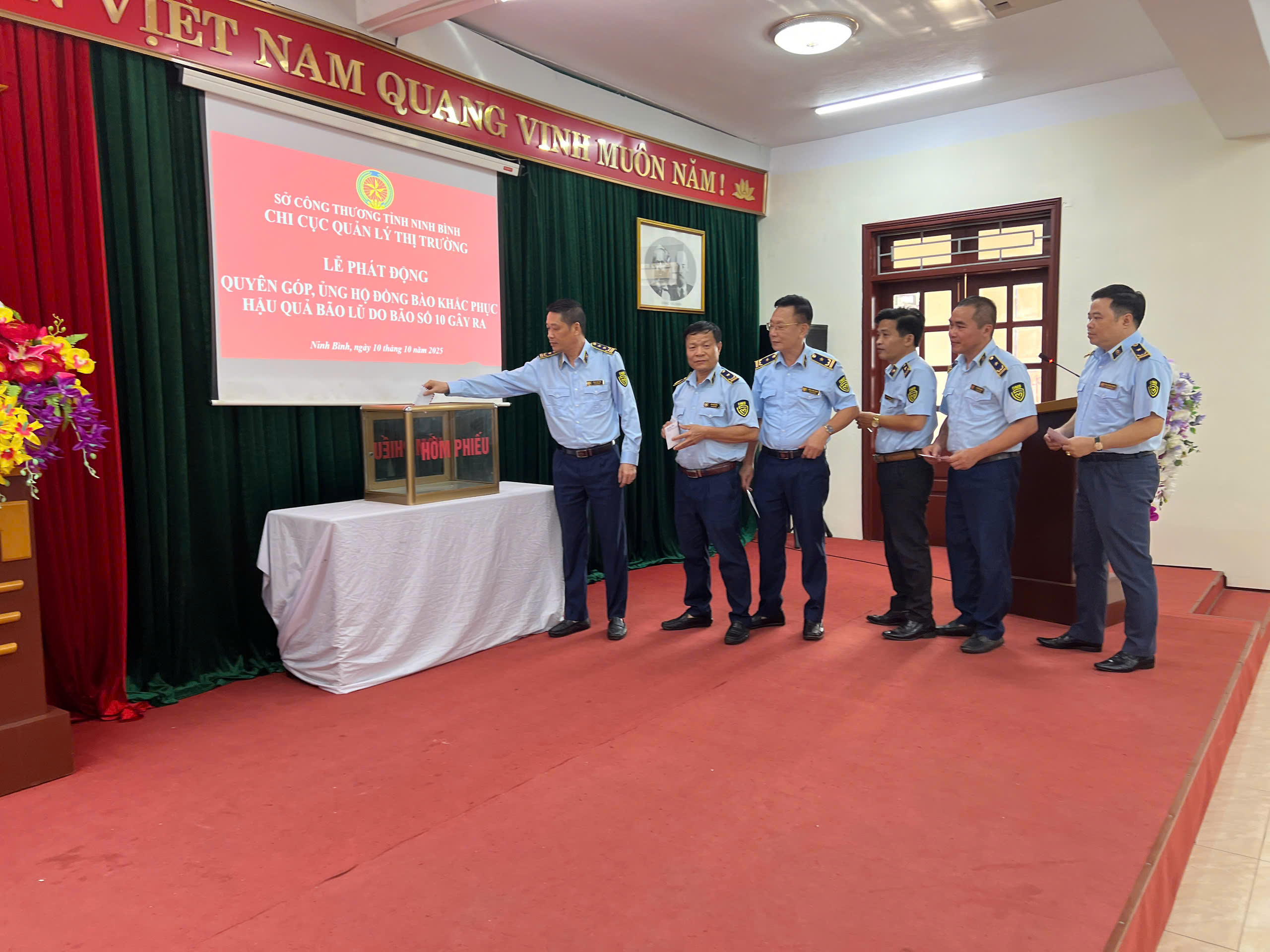 Hưởng ứng Thư kêu gọi của Ủy ban Mặt trận Tổ quốc Việt Nam tỉnh Ninh Bình về việc ủng hộ nhân dân khắc phục thiệt hại do bão số 10 gây ra, thực hiện văn bản số 1519/SCT-VP ngày 07/10/2025 của Sở Công Thương tỉnh Ninh Bình, Chi cục Quản lý thị trường (QLTT) tỉnh Ninh Bình đã tổ chức phát động quyên góp ủng hộ đồng bào bị ảnh hưởng bởi bão lũ.