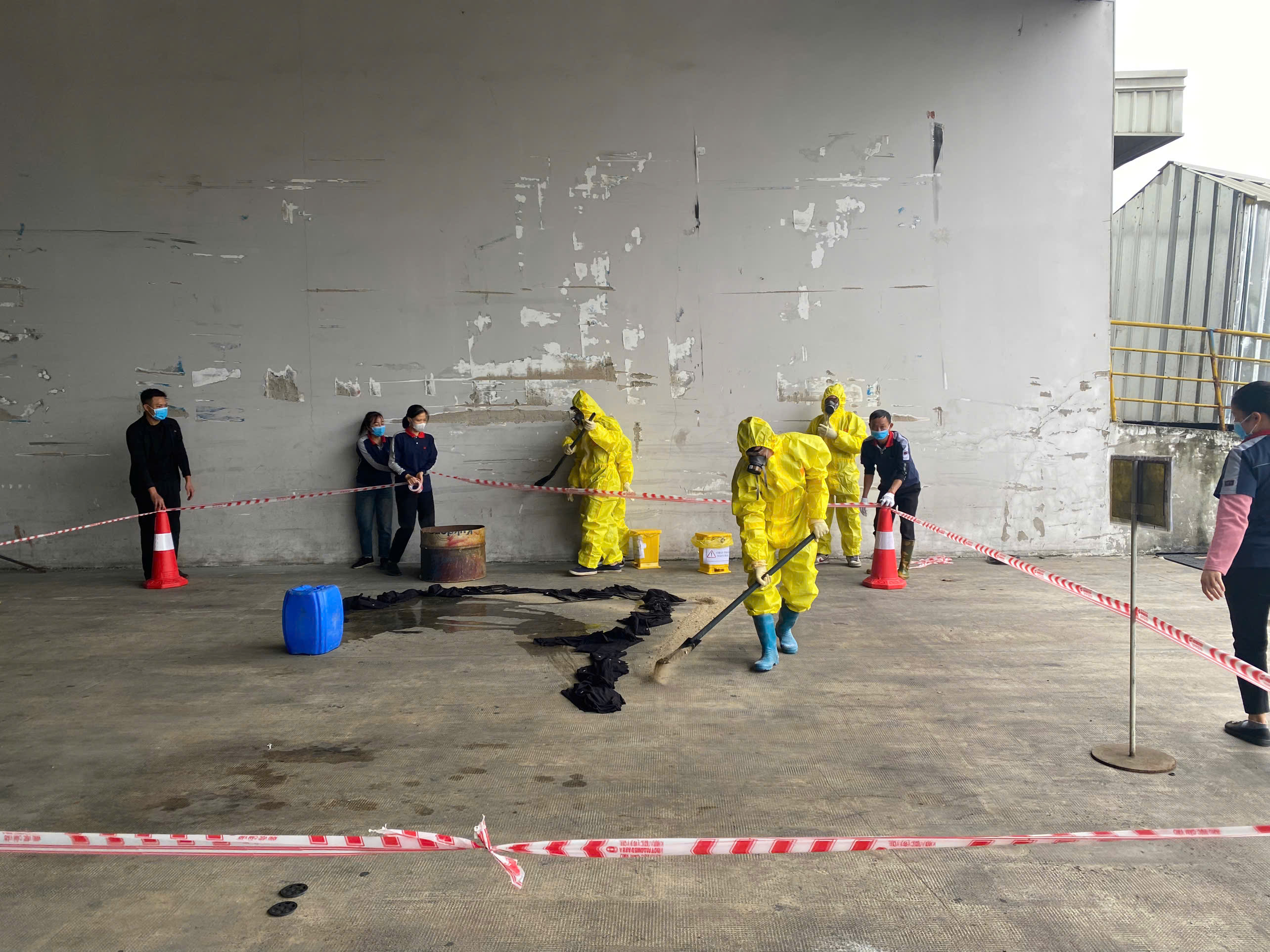 Theo tình huống giả định, trong quá trình vận chuyển, một công nhân làm đổ can chứa khoảng 10 lít hóa chất Sodium Hypochloride (NaClO) tại khu vực cửa kho, gây tràn đổ trên diện tích khoảng 5 m². Ngay sau khi xảy ra sự cố, đội ứng phó khẩn cấp của Công ty gồm 10 thành viên đã nhanh chóng triển khai các bước xử lý: Hô hoán báo động, sơ tán người khỏi khu vực nguy hiểm, khoanh vùng hiện trường, sử dụng các dụng cụ chuyên dụng như bao cát, giẻ lau, xẻng, cát thấm để ngăn và thu gom hóa chất tràn đổ, sau đó tiến hành thu gom chất thải nguy hại đúng quy định.